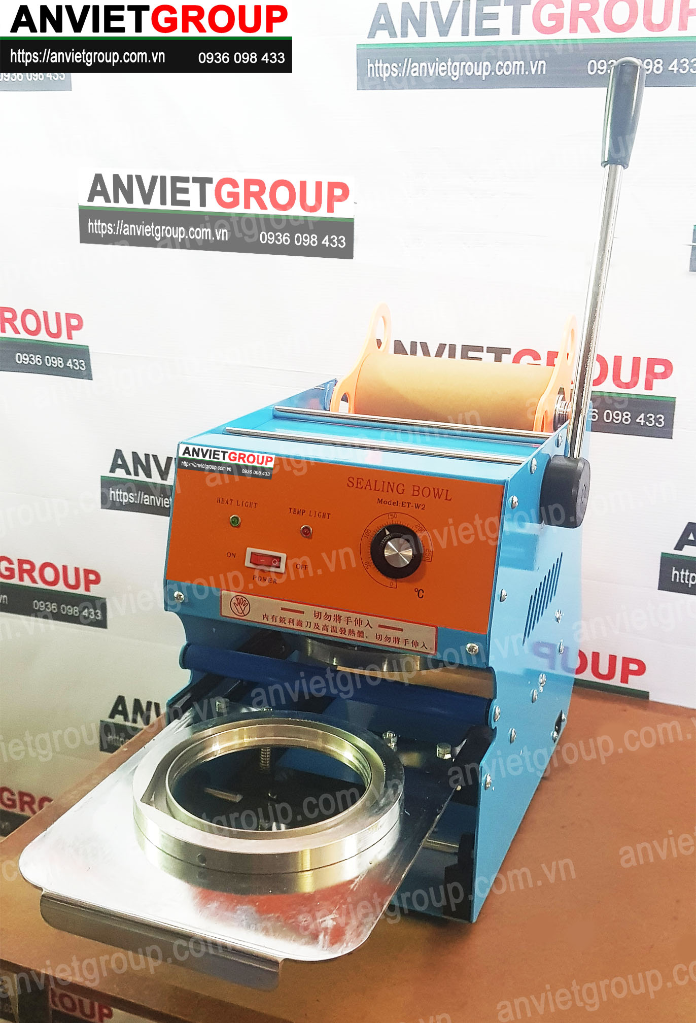 Máy đóng đậy ép dập nắp miệng ly cốc khổng lồ Eton W2B An Việt có thiết kế đơn giản rất dễ sử dụng, mặt trước của máy là bộ điều chỉnh nhiệt cho phép người dùng có thể dễ dàng điều chỉnh để phù hợp với vật liệu của cuộn màng ép.