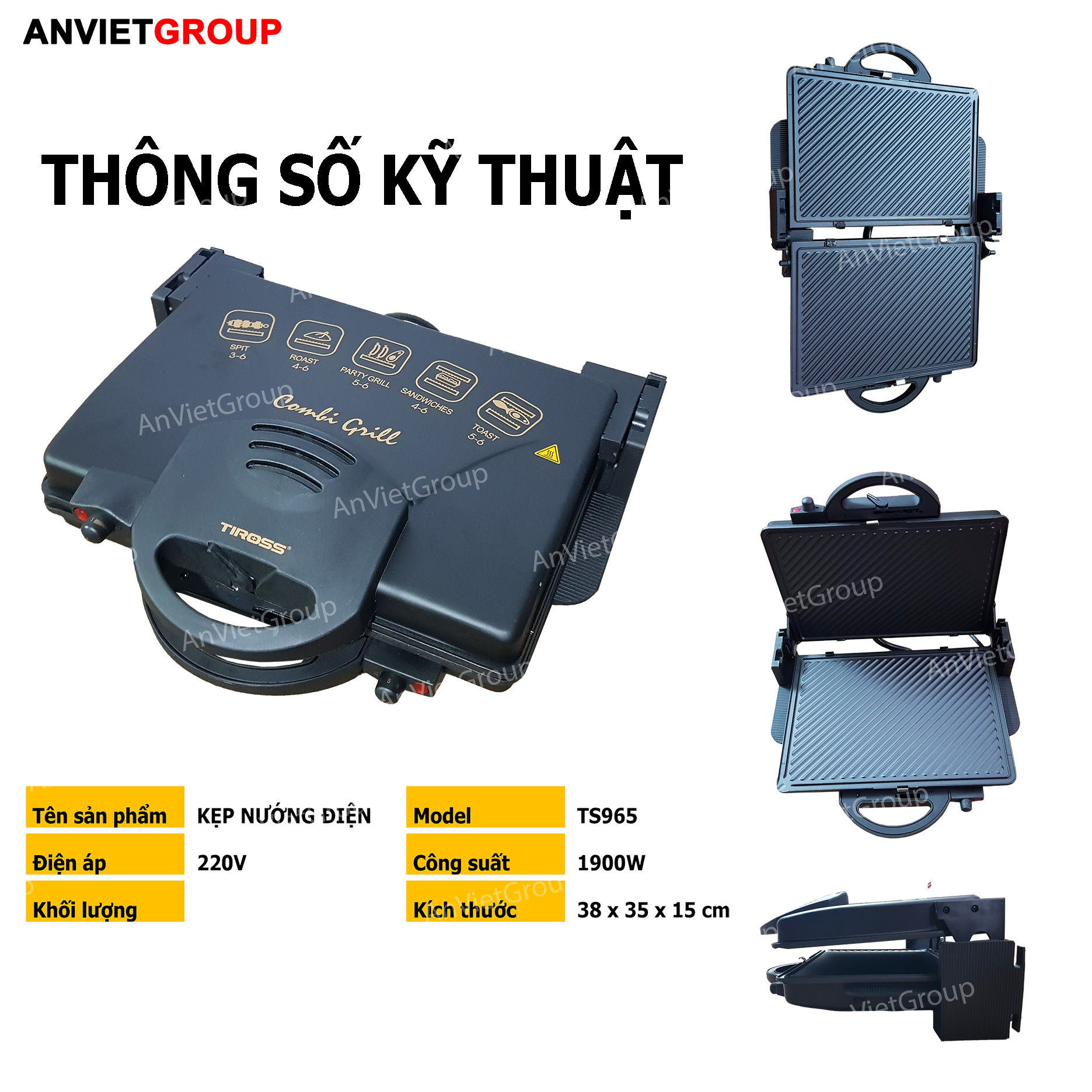 Kẹp nướng điện thịt đa năng Tiross TS-965 có tông màu đen sang trọng, sạch sẽ. Sản phẩm có thiết kế chắc chắn, có tay cầm chống bỏng giúp nướng thực phẩm an toàn.
