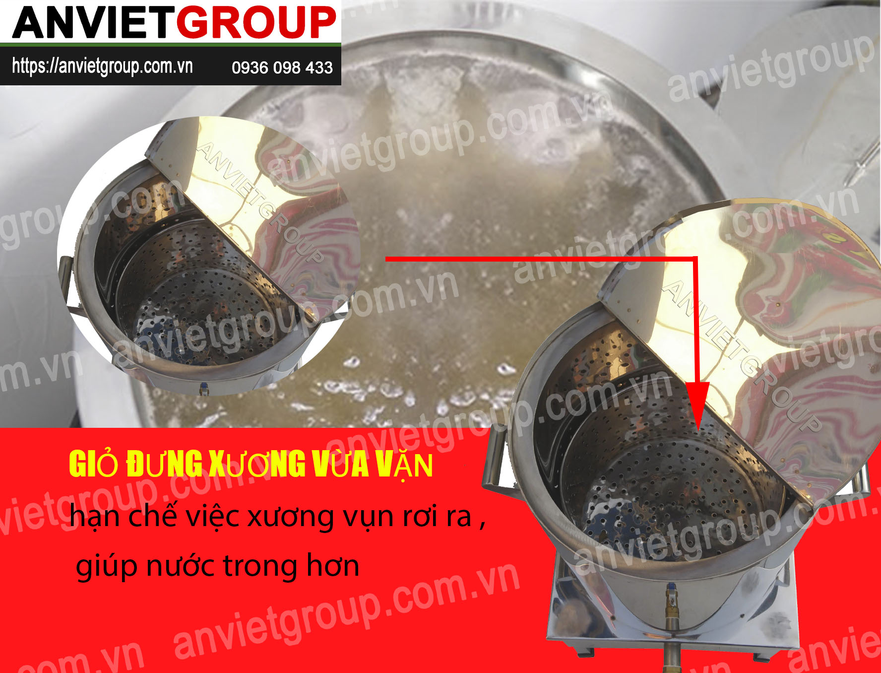 Thiết kế nồi hầm xương 60 lít An Việt có thêm giỏ đựng xương đi kèm có tác dụng đựng xương, rau củ giúp nước lèo trong hơn, hạn chế xương vụn khi lấy nước lèo chan phở. Những lỗ nhỏ trên giỏ xương được thiết kế khoa học sẽ giúp việc ninh xương, rau củ thuận lợi hơn.