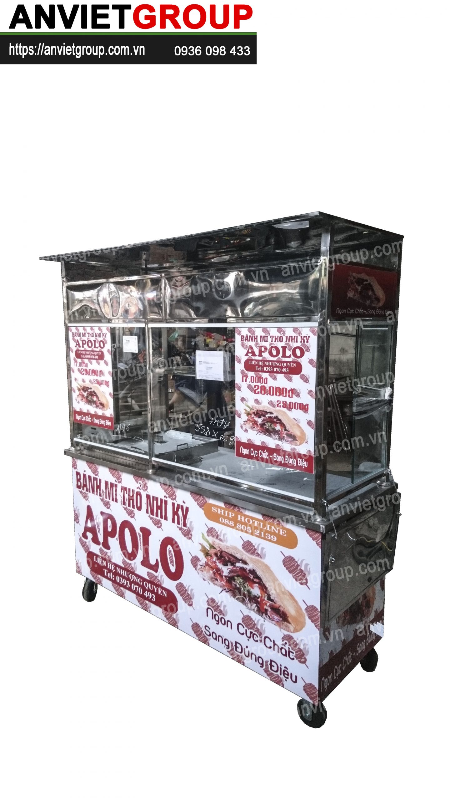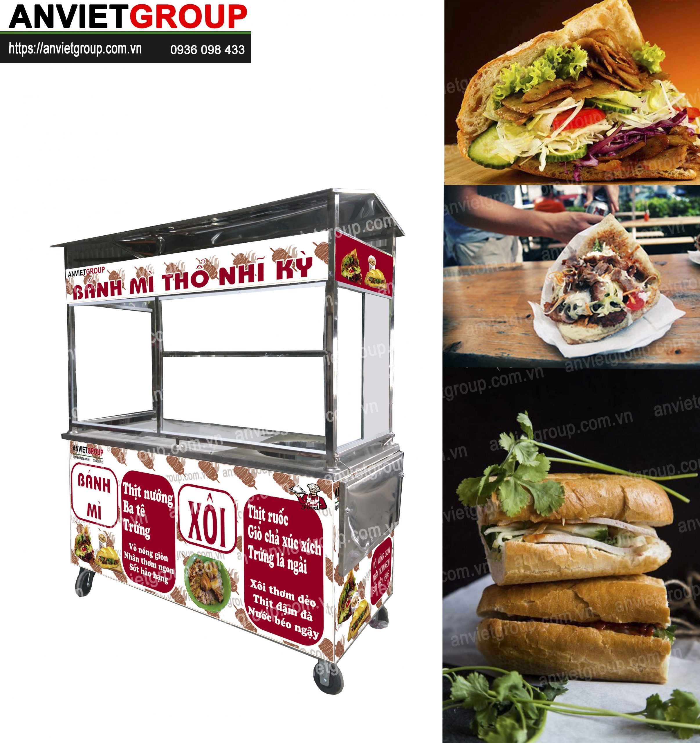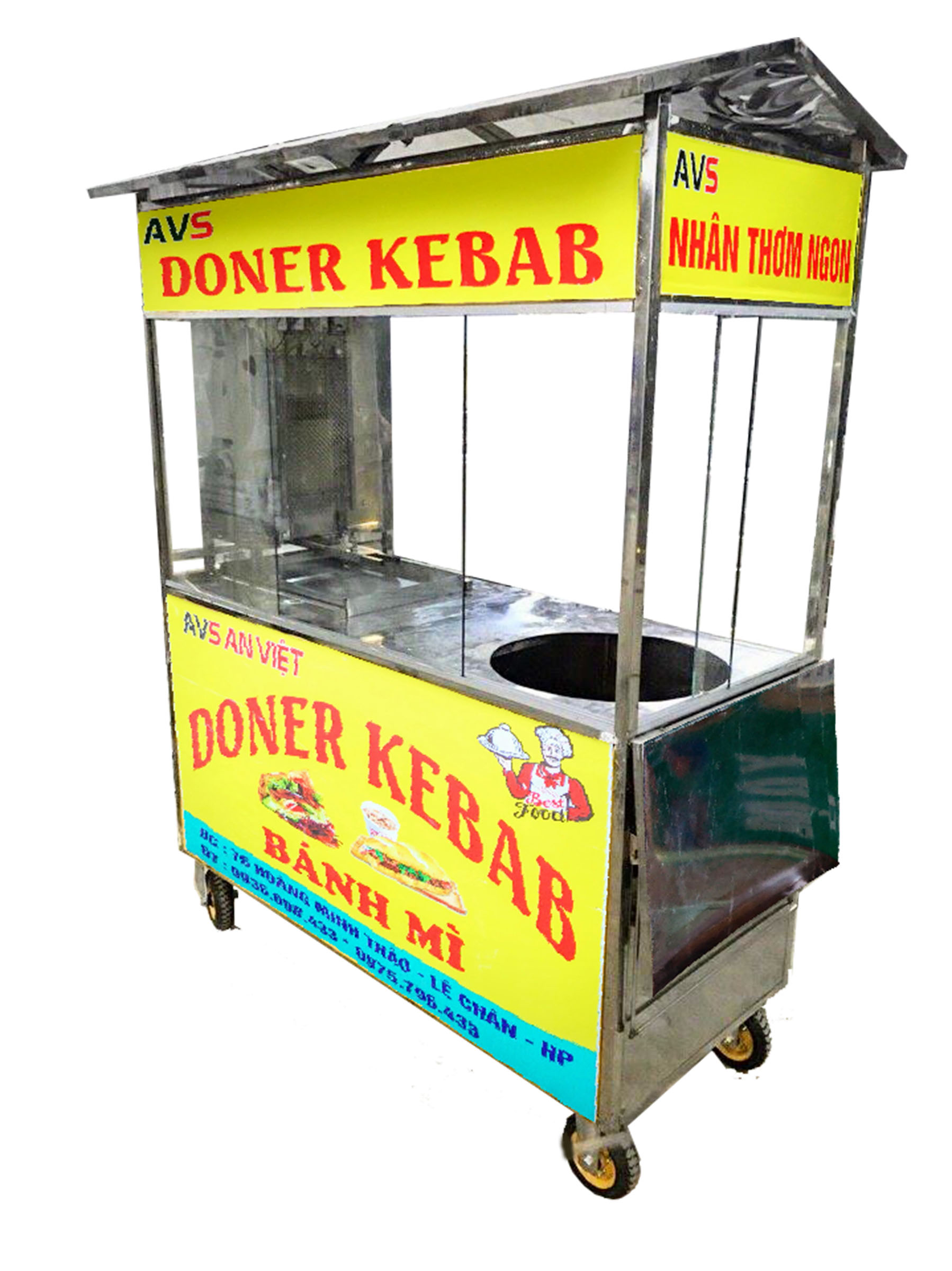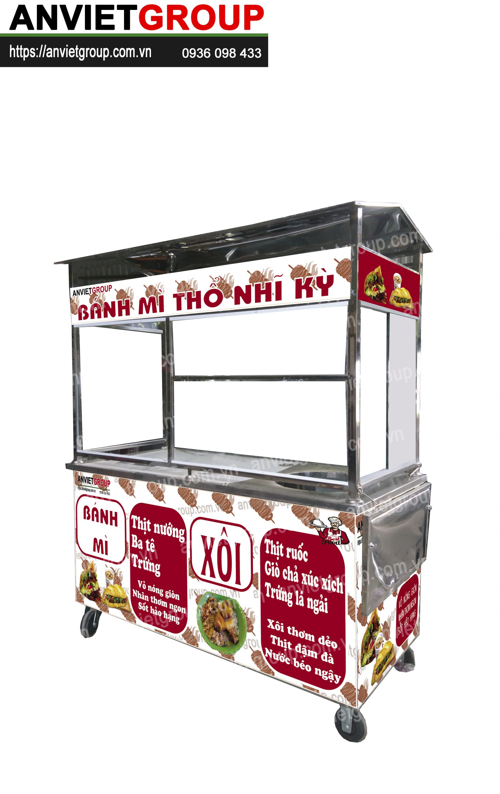 Một bộ xe bán xôi bán bánh mì thổ nhĩ kỳ 1m6 An Việt bao gồm : Xe bán xôi bán bánh mì, lò nướng thịt doner kebab, chõ xôi inox, dao cắt thịt doner kebab