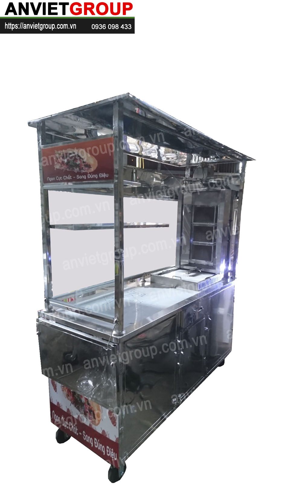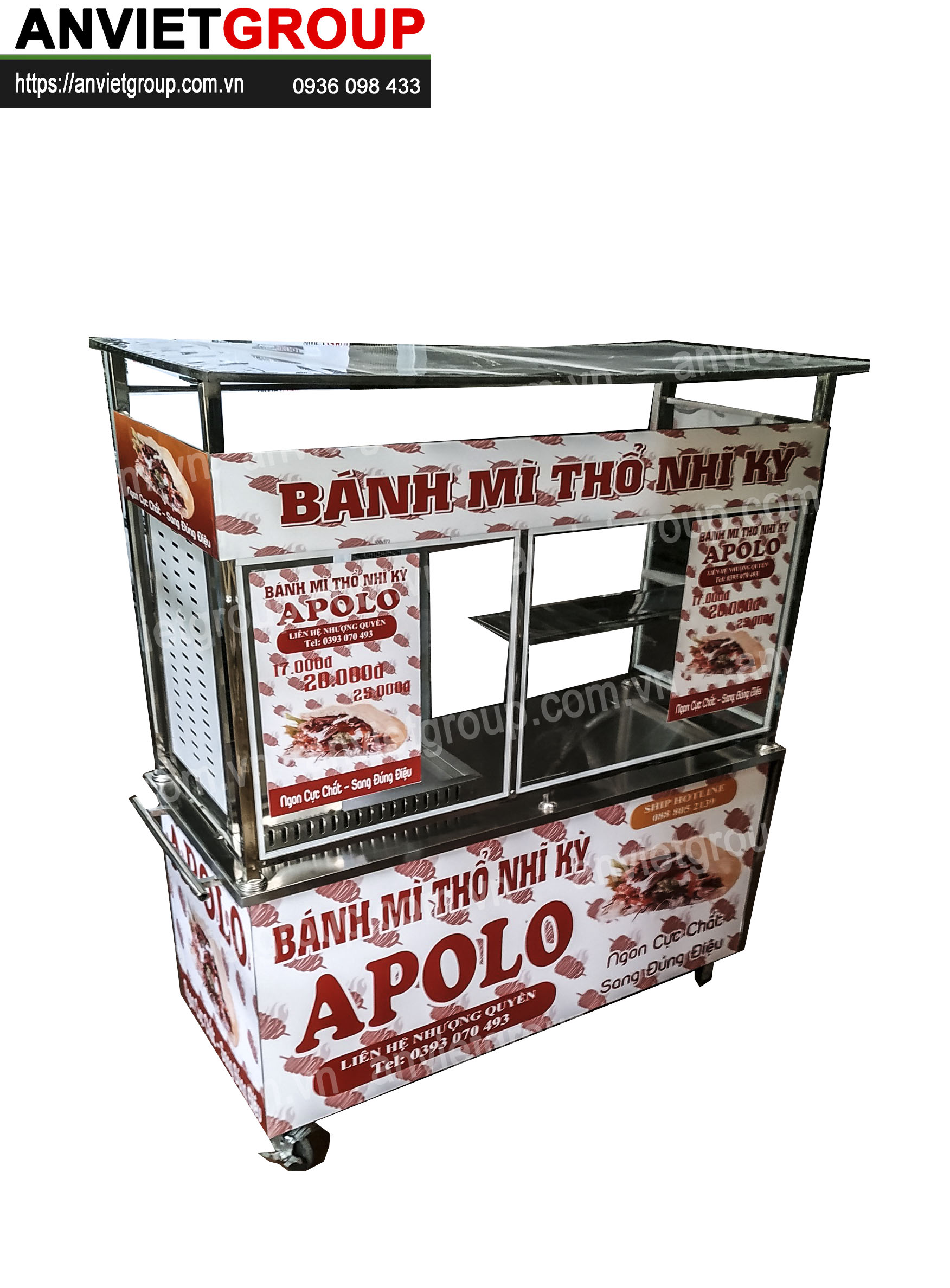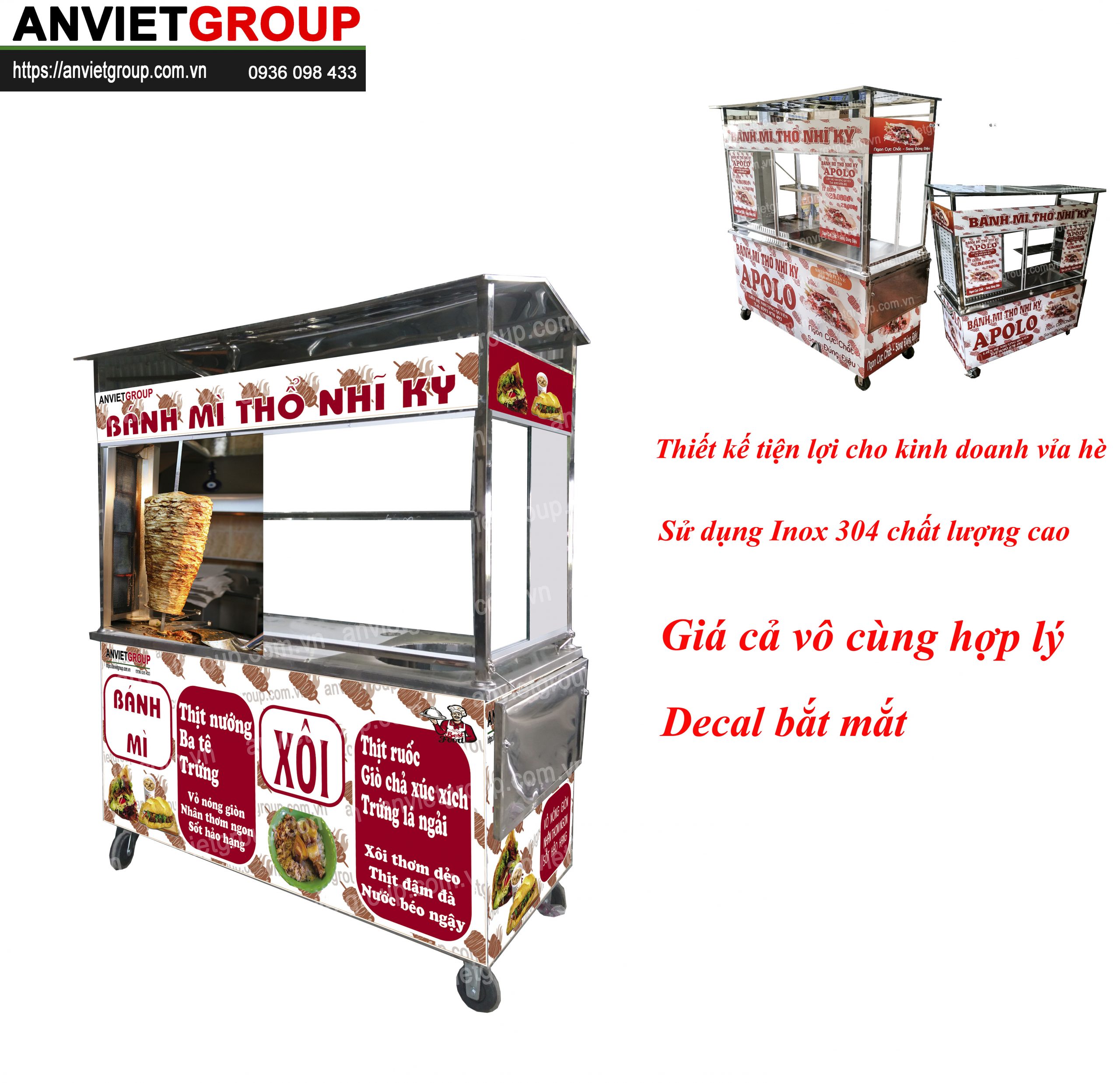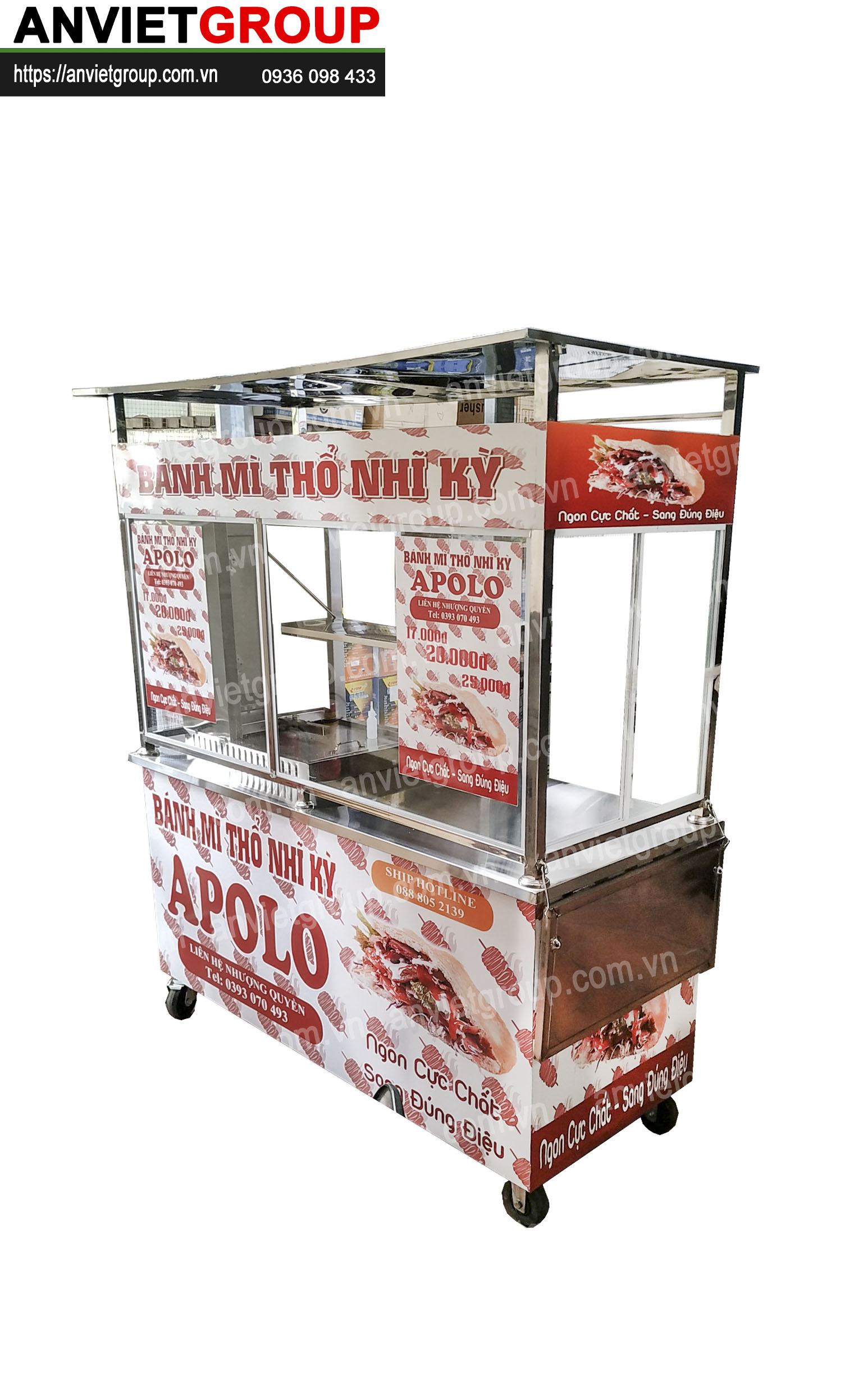 Một bộ xe bán xôi bán bánh mì thổ nhĩ kỳ 1m6 An Việt bao gồm : Xe bán xôi bán bánh mì, lò nướng thịt doner kebab, chõ xôi inox, dao cắt thịt doner kebab
